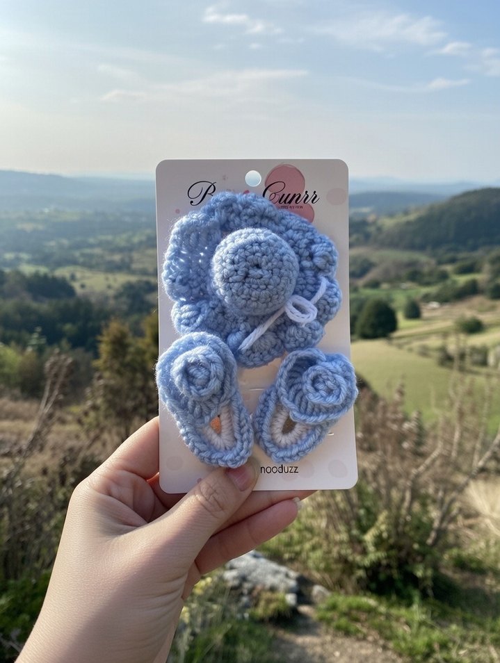 Nakışlı bohem tarzda, pastel mavi örgü çocuk saç aksesuarı seti, sade ve temel bir görünüm sunar.