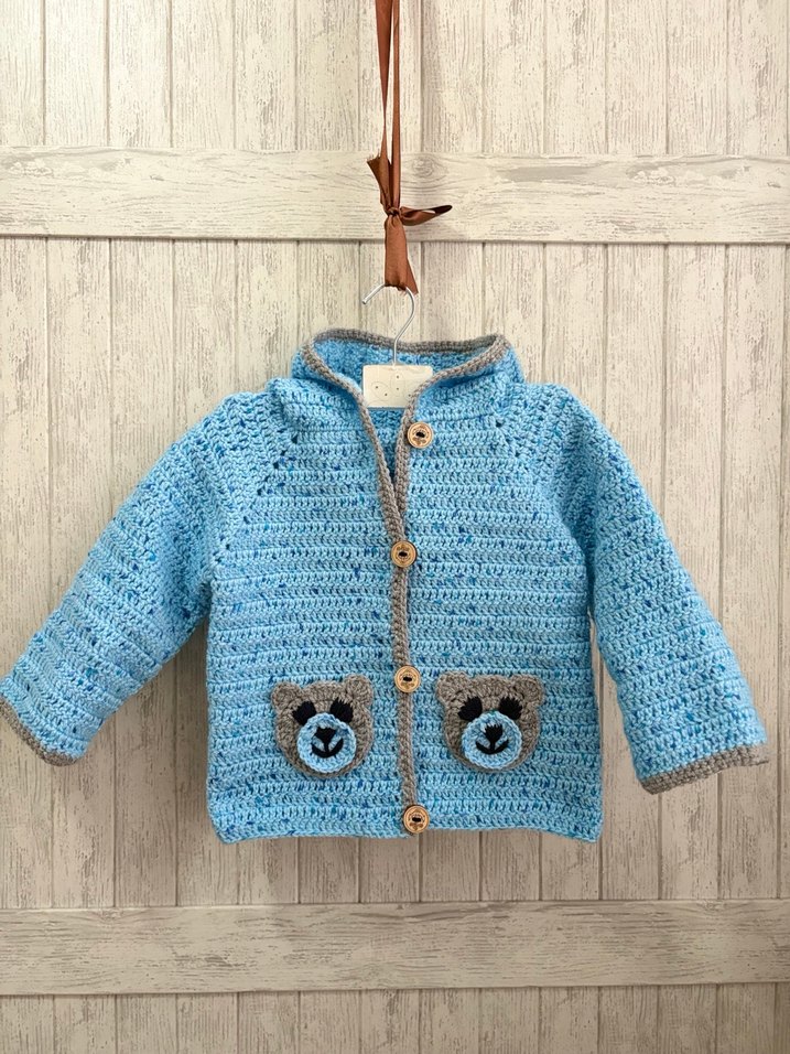 Uzun kollu, bol kesim erkek çocuk hırkası, mavi örgü kumaştan ve ceplerinde renkli nakışlı ayı desenleri bulunur. Ahşap düğmelidir.