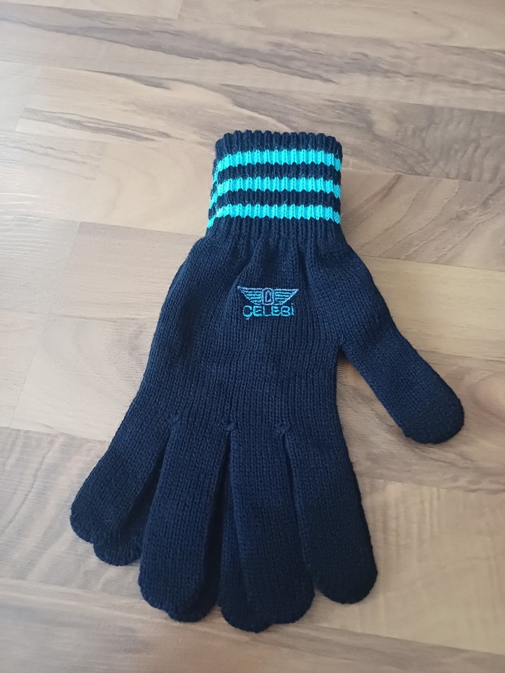 Mavi renkli, renkli çizgili manşetlere ve nakışlı detaya sahip örgü erkek eldiveni, yumuşak örgü kumaştan, sokak tarzı için uygun.Sıfır hic kullanılmadı