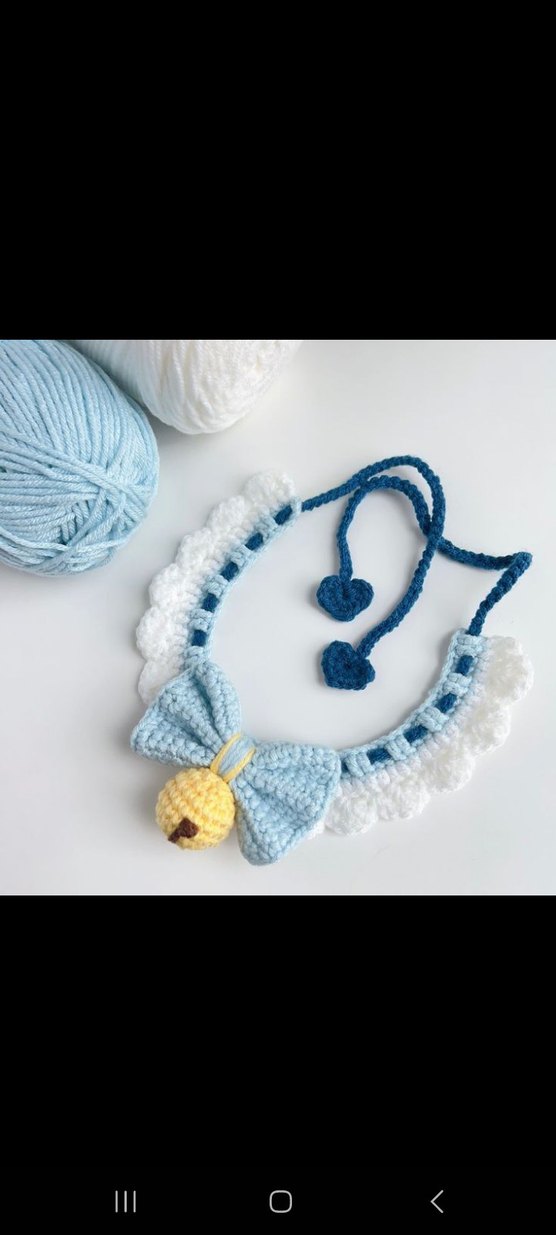 Pastel mavi tonlarda, nakışlı detaylı, kısa örgü kolye. Fiyonk ve sarı küçük süsüyle rahat kedi tasması