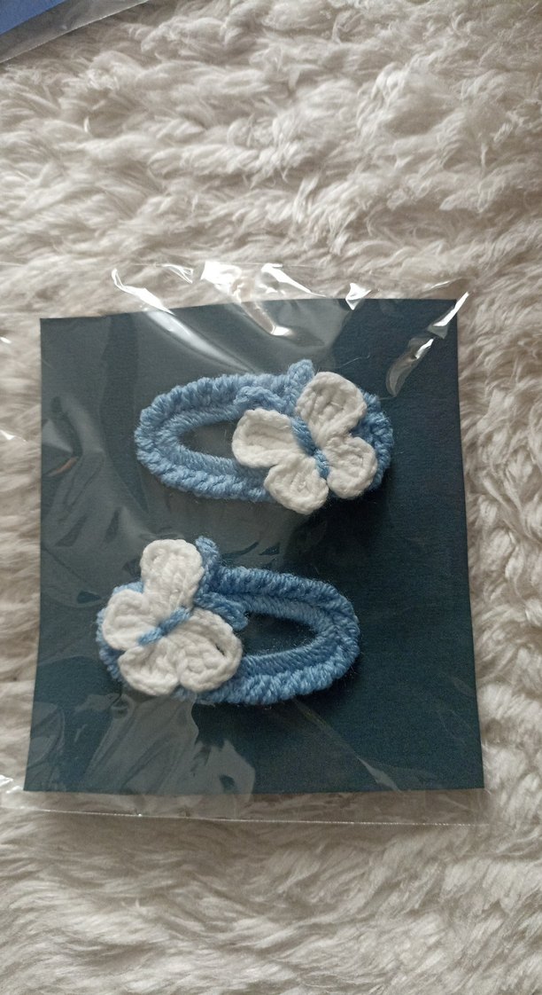 Mavi örgü tokalar, beyaz nakışlı kelebek detaylarıyla sade ve renkli bir görünüm sunar.