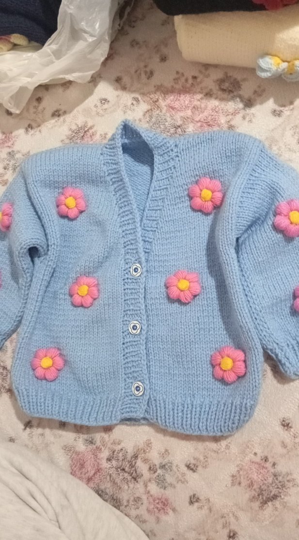 Pastel mavisi, pembe nakışlı çiçeklerle süslenmiş, uzun kollu ve bol kesim örgü kız hırkası.