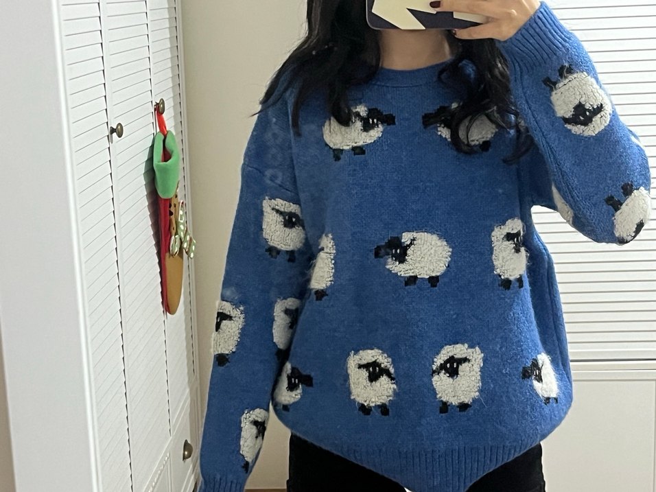 Bu rahat koyu mavi yün kazak, bol kesim, yuvarlak yaka ve uzun kolludur. Nakışlı koyun desenleriyle örgü tarzda, günlük sokak modasına uygundur.
