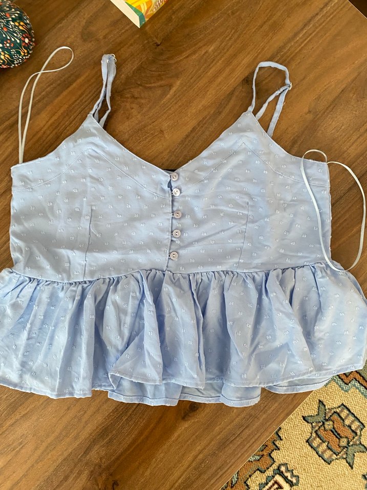 Mavi Nakışlı Pamuklu Fırfırlı Askılı Bluz