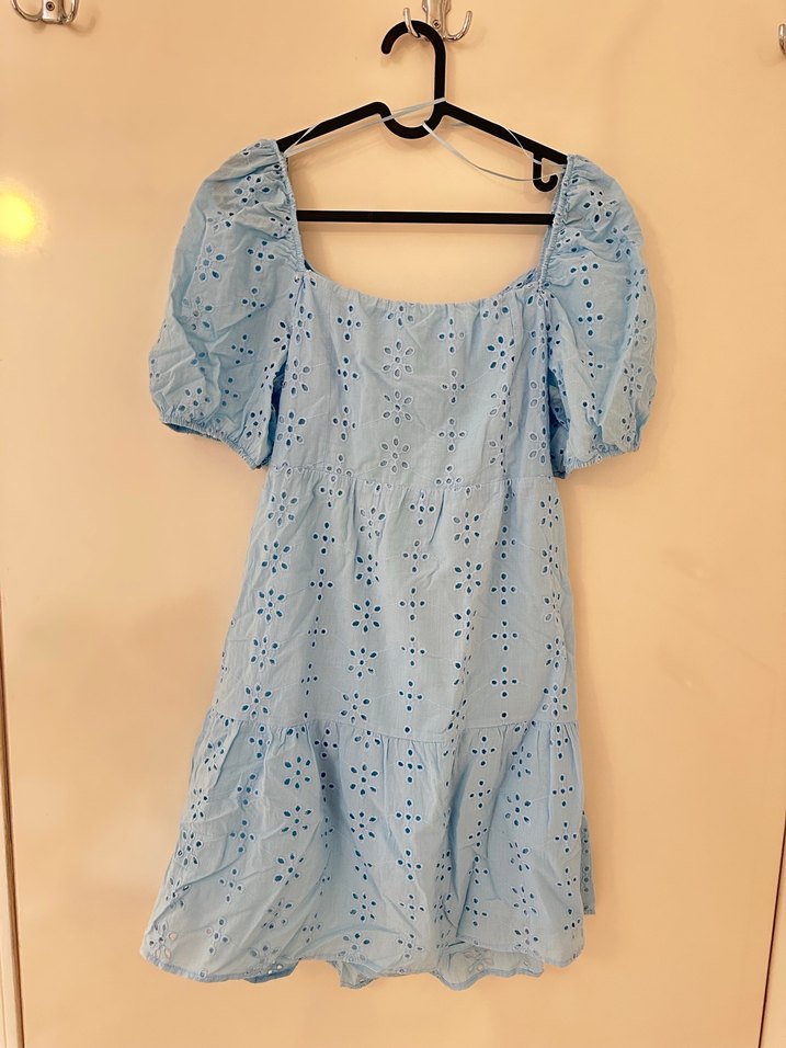 Nefes alabilen pamuk kumaştan, mavi renkte, dantel nakışlı, balon kollu ve geniş kesim midi elbise, tekne yaka ile rahat kullanım sağlar. Arkasındakı detay çok şık hale getirdi. Çoz az kullanıldı