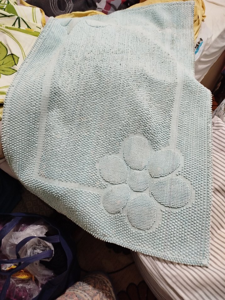 Nakışlı çiçek desenli, dokulu yüzeye sahip pastel mavi banyo paspası.