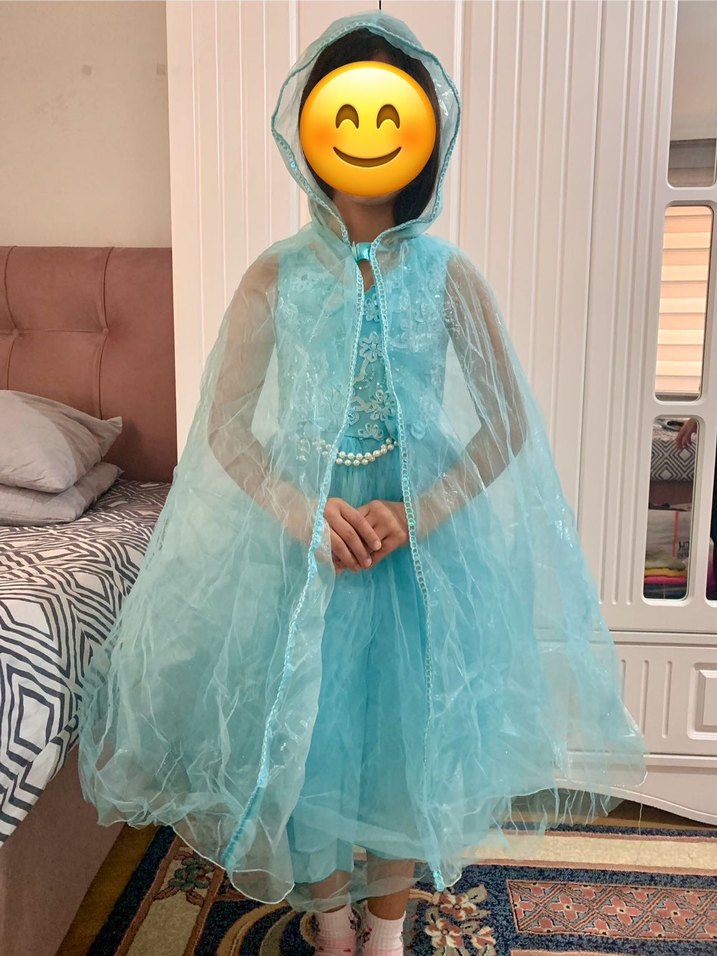 Nakışlı, şeffaf kapüşonlu mavi elbise, kolsuz ve straplez. İnce ve fitted normcore tarzda,defosuz bir kere giyildi 4,5,6 yaş için uygun indirim için yazabilirsiniz