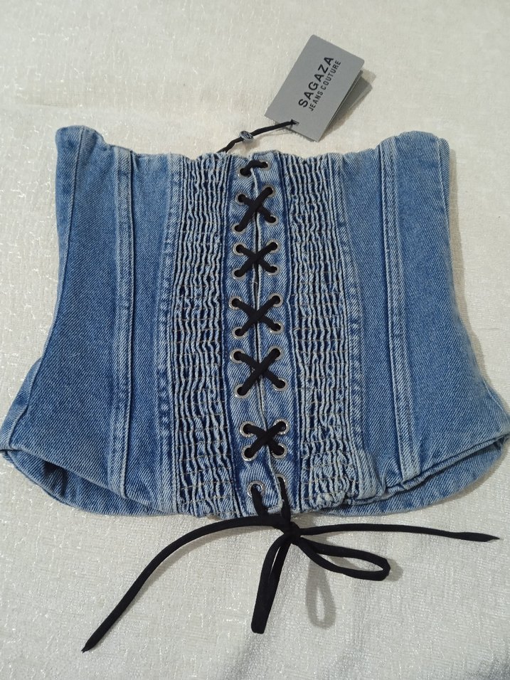 Nakış detaylı, kemerli, straplez ve fit kesim mavi denim büstiyer. Önde bağcıklı kapanış vardır, dış mekan ve gotik tarz için uygundur.