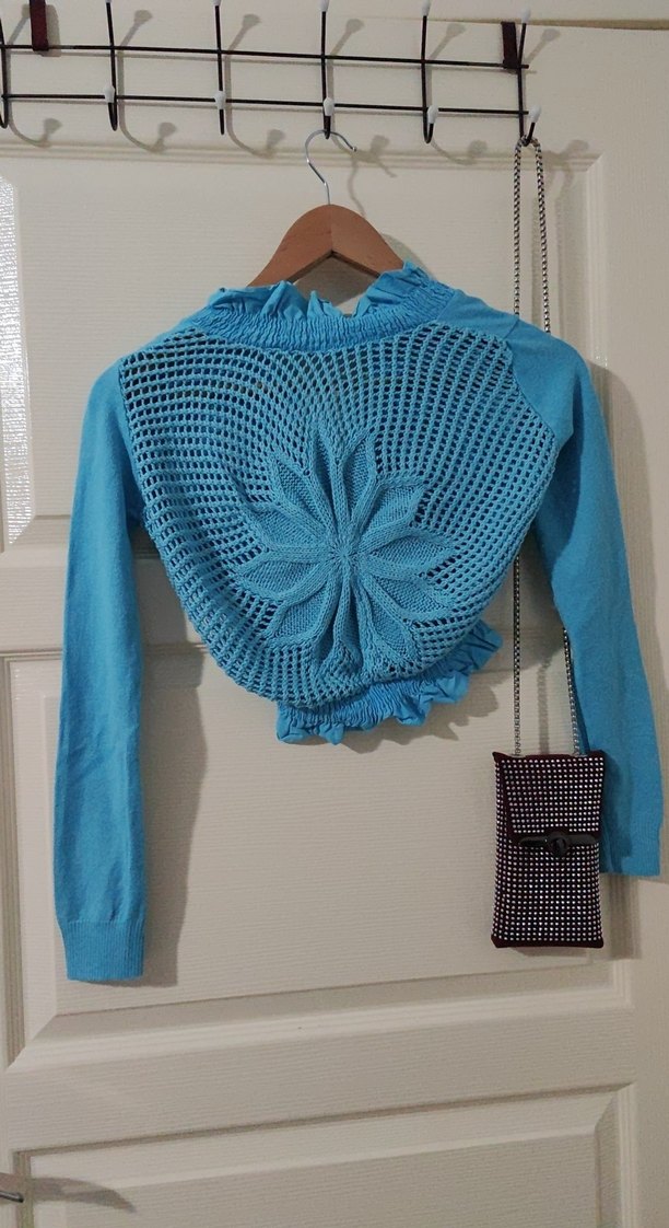 Pastel mavi renkte, uzun kollu ve V yakalı, nakışlı triko kız çocuk bolero. Fıt kesim ve fırfırlı detaylarla şık bir sokak stili sunar.