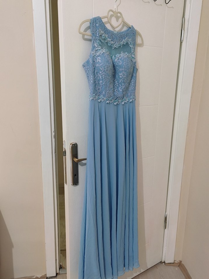 bebe mavisi uzun abiye elbise, nakışlı dantel detayları ve straplez, kolsuz tasarımıyla şık bir görünüm sunar.