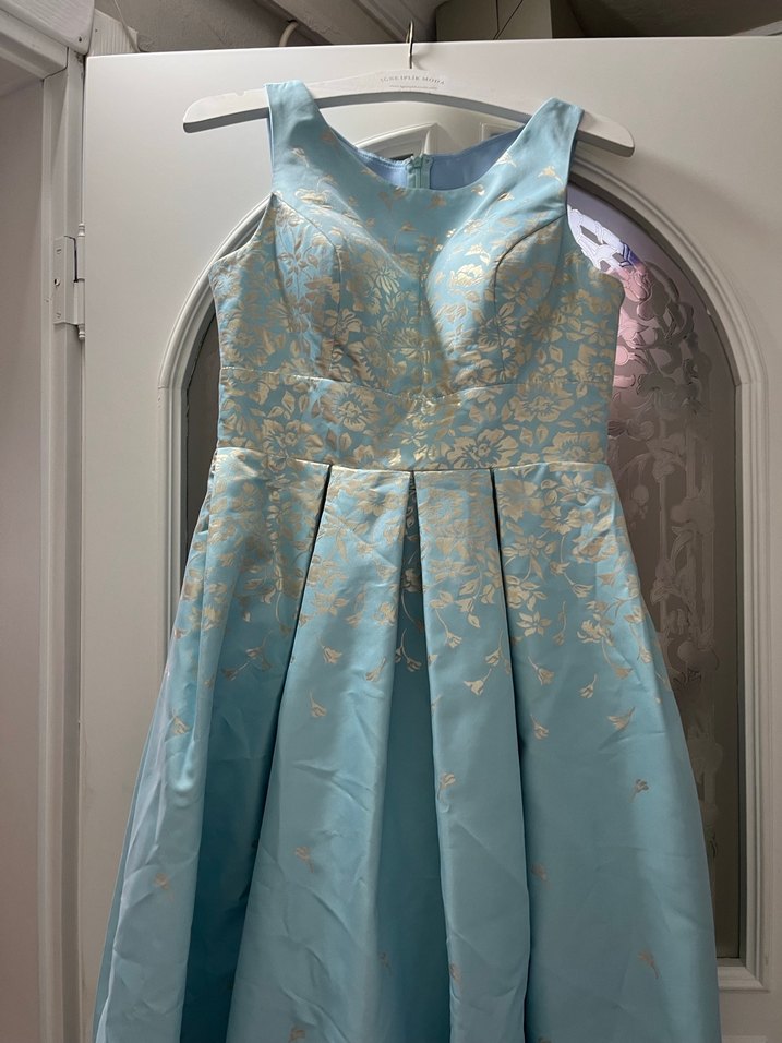 Mavi Nakışlı Uzun Abiye Elbise