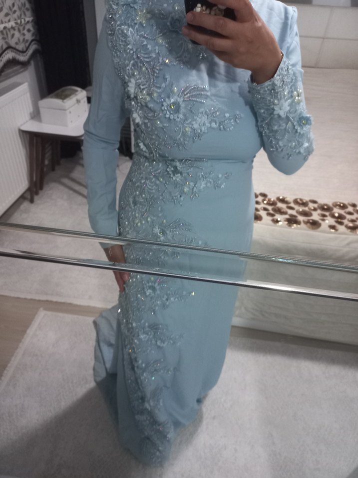 Mavi pastel tonlarında, yüksek yakalı ve uzun kollu, işlemeli ve boncuk detaylı, klasik kesim uzun abiye elbisedir. sadece 1 kere giyilmistir. Arkadan uzun kuyruğu var.renk görüldüğü gibi