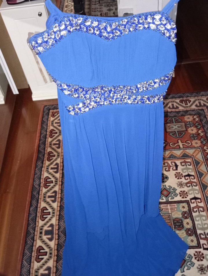 Mavi renkli, nakış detaylı, uzun ve drapeli abiye elbise. Straplez, kolsuz ve vücuda oturan kesimiyle bohem tarzını yansıtır. Düğün gibi özel anlar için uygundur.