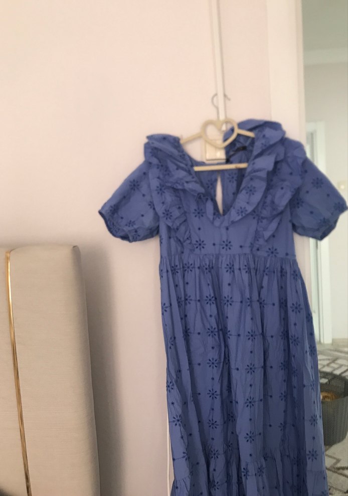 Mavi uzun elbise, bol kesim, fırfırlı detaylar ve nakışlı desenlere sahiptir. V yaka ve askılı kollarıyla bohem tarzını yansıtır. Hamilelik dönemimde giymiştim