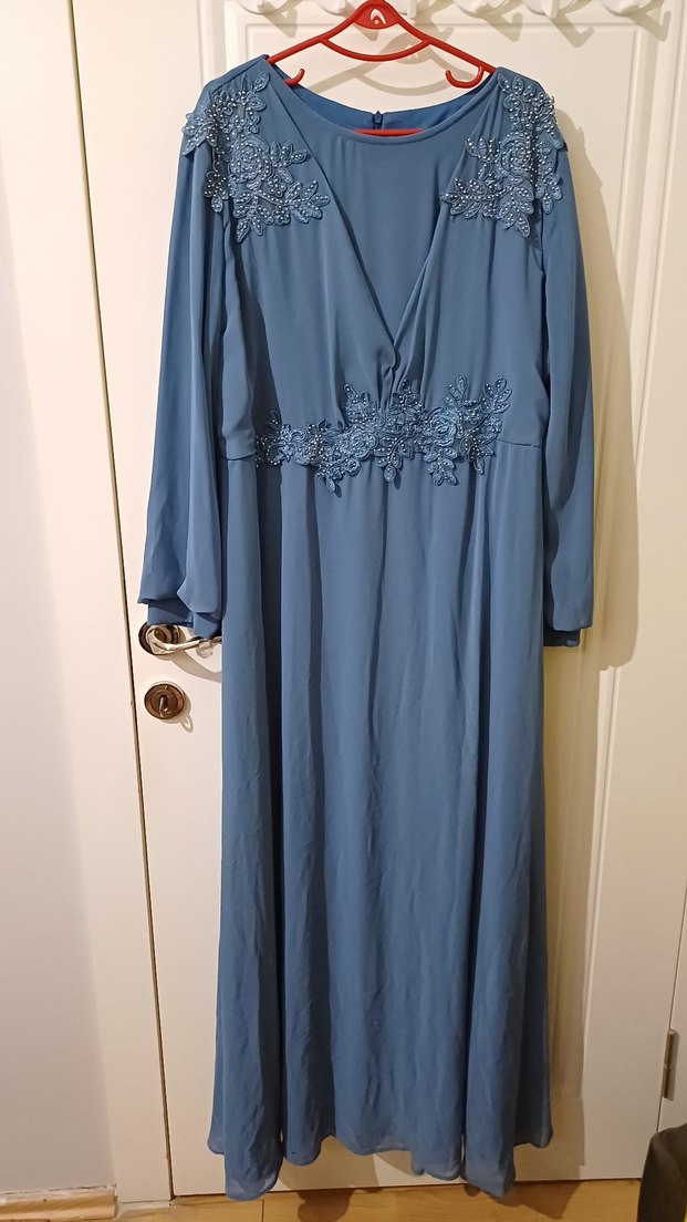 Bu uzun mavi elbise, bol kesim, drapeli detaylar ve nakışlı desenlere sahiptir. Boyu 146 cm iki koltuk arası mesafe 58 cm bel 50 cm dir. tül kısmında küçük bir delik vardır