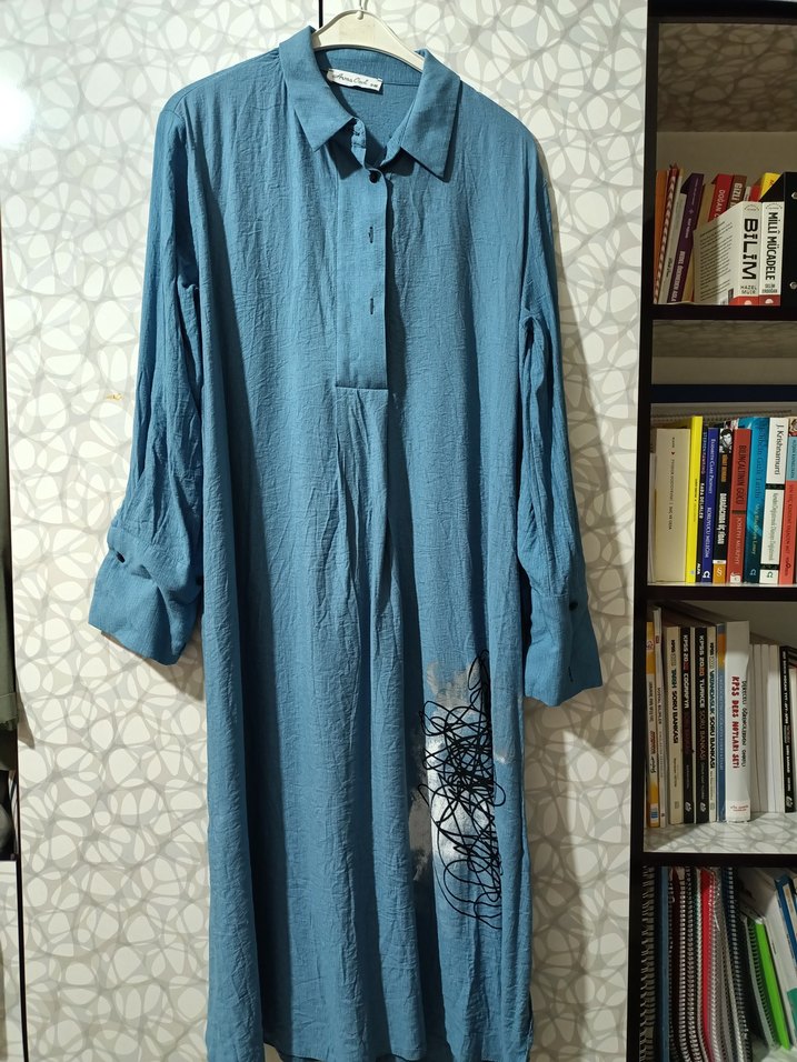 Yumuşak keten kumaştan, bol kesim uzun kadın tunik. Uzun kollu, yakalı, düğmeli ve nakış detaylıdır. Günlük kullanıma uygundur.