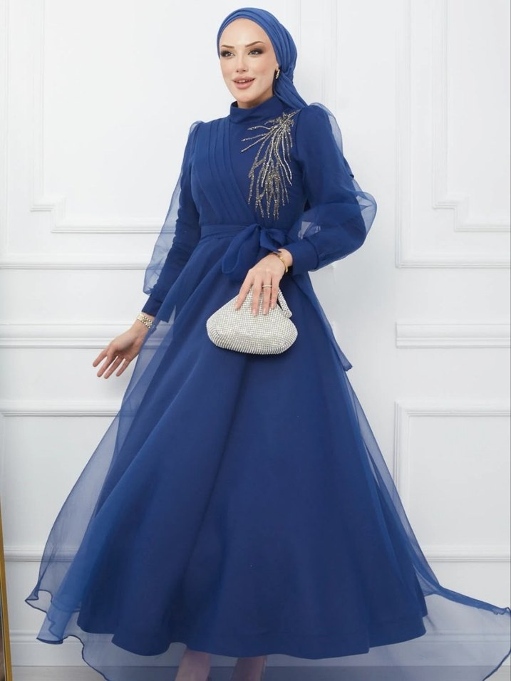 Mavi Nakışlı Uzun Kollu Abiye Elbise