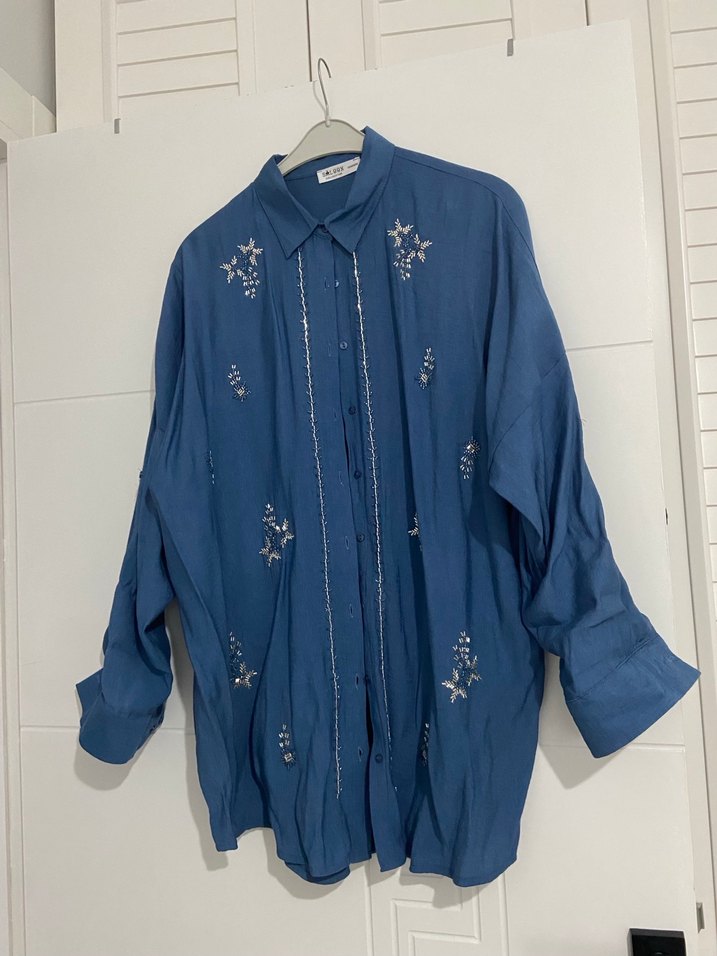 Mavi Nakışlı Uzun Kollu Bohem Gömlek