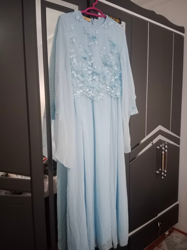 bebe mavi renkte, uzun kollu, 3d çiçek detaylı ve uzun kadın abiyesi. Yüksek yakalı, bol kesim vintage tarzda, düğün için uygun.