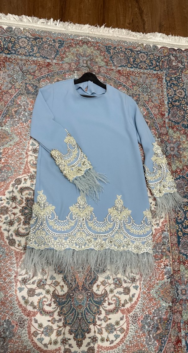 Mavi renkte, uzun kollu, nakış ve püskül detaylı, tesettür bohem tarzda, düğünlere uygun uzun elbise.