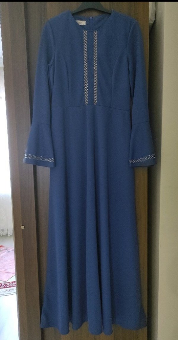 Mavi renkli, uzun kollu ve yakalı, nakış detaylı uzun elbise. Drapeli ve klasik kesim olup günlük ya da özel günler için uygundur. Sadece 1 kez evde giyilmiş olup sıfır ayarındadır.