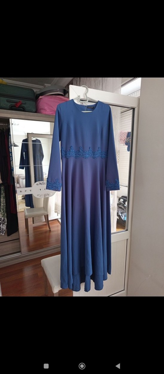 Koyu mavi renkte, uzun kollu ve bisiklet yaka uzun elbise. Bel ve kol manşetlerinde nakış detayları bulunur. Sentetik kumaş, 1 kere düğünde giyildi daha giyilmedi temiz