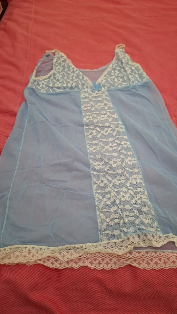 Kolsuz, vücuda oturan gece elbisesi, pastel mavi kumaş ve ön ile etek ucundaki vintage nakışlı dantel detaylarıyla bohem tarzını yansıtıyor. göyüs ölçü 45 cm iç gösteriyor