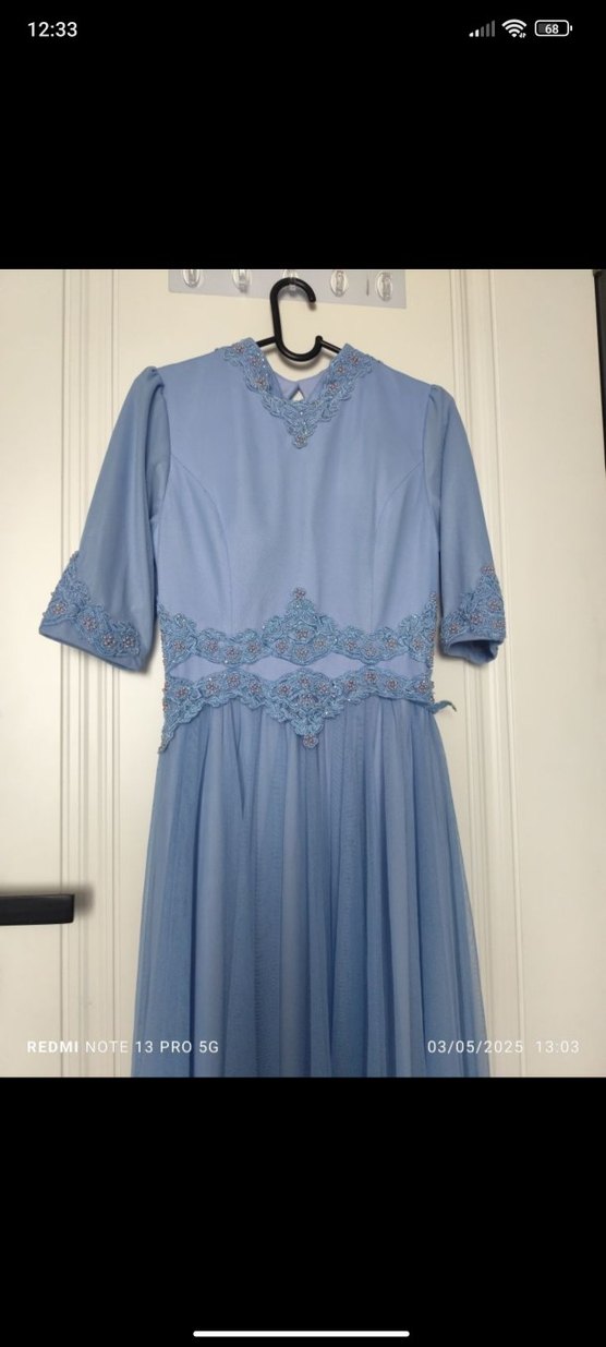 Mavi pastel tonlarında, V yaka, nakış detaylı, kısa kollu, bele oturan ve drapeli vintage uzun abiye elbise.