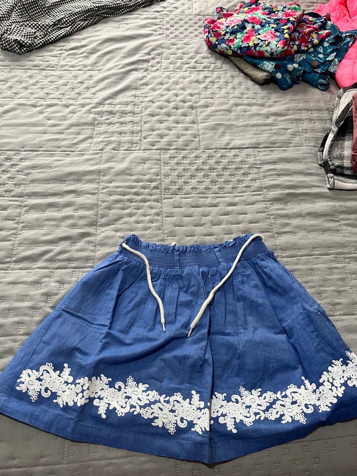 Mavi renkte, nakış desenli ve volan detaylı, bol kesim mini etek. Yumuşak kumaştan, bohem tarzına uygun.