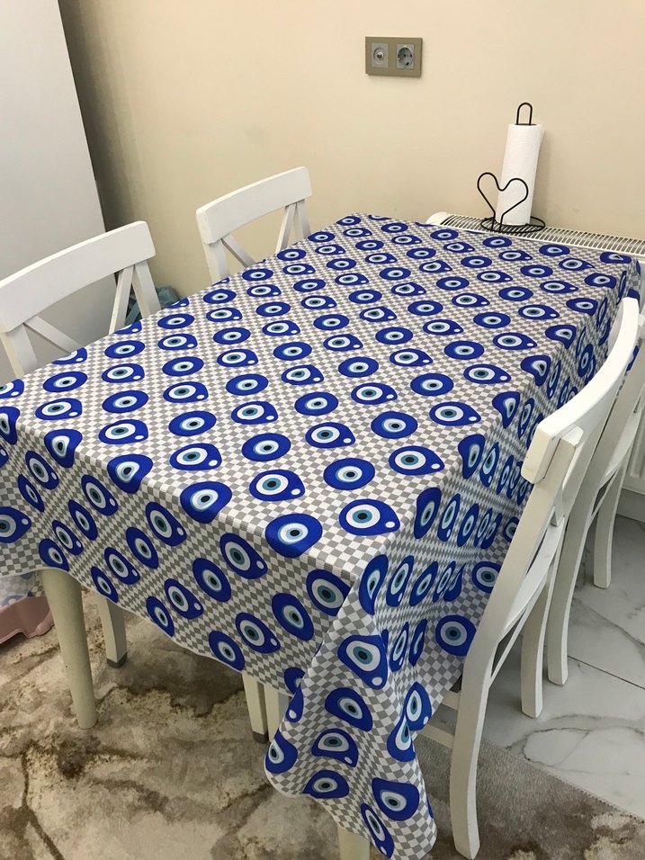 Mavi ve gri kareli klasik desenli masa örtüsü, yumuşak dokusuyla yemek alanlarına şık bir görünüm kazandırır. 150x150cm jarse leke tutmaz sofra bezi masa örtüsü Sıfır ürün