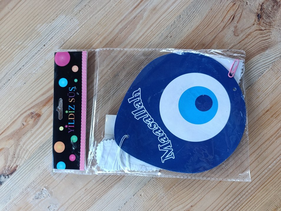 Koyu mavi renkte, nazar boncuğu ve 'Maşallah' yazılı parti süsü. Koruyucu anlam taşır.