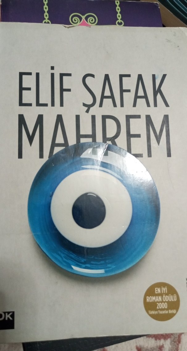 Minimalist tarzda, mavi renkli nazar boncuğu desenli rozet. Üzerinde 'ELIF ŞAFAK MAHREM' yazısı ve roman ödülü bilgisi bulunur.
