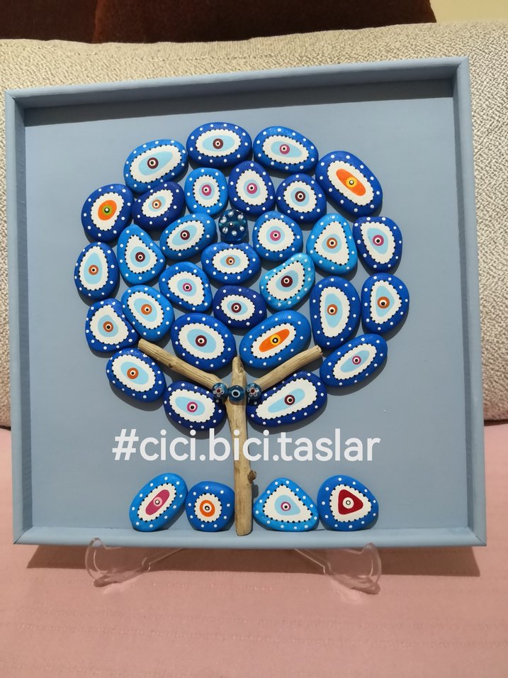 Koyu mavi nazar boncuğu desenli deniz taşlarından oluşan ahşap tablo. Kendi tasarımımdır. Ağaç şeklinde dizilmiş ve ahşap zemin üzerine kenarları kurdele dekoratif tablo. Ayakları ile beraber gönderilecektir.