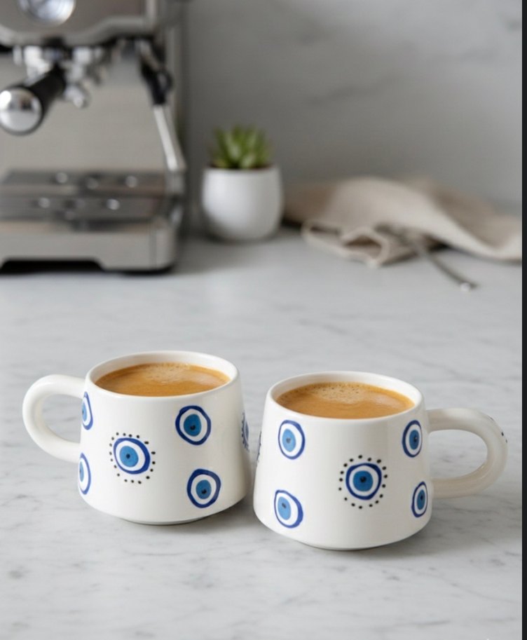 Mavi nazar desenleriyle süslenmiş beyaz seramik kupalar, kahve veya çay servis etmek için uygundur. Her kupa rahat tutuş ve pürüzsüz bir yüzeye sahiptir. ☕