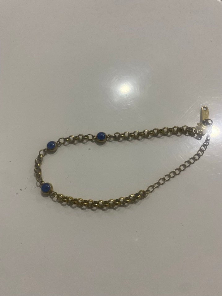 Kadın bileklik, zincir detaylı ve mavi nazar taşlıdır. Altın rengi kullanılmışlık fiyata yansıtıldı iade yoktur