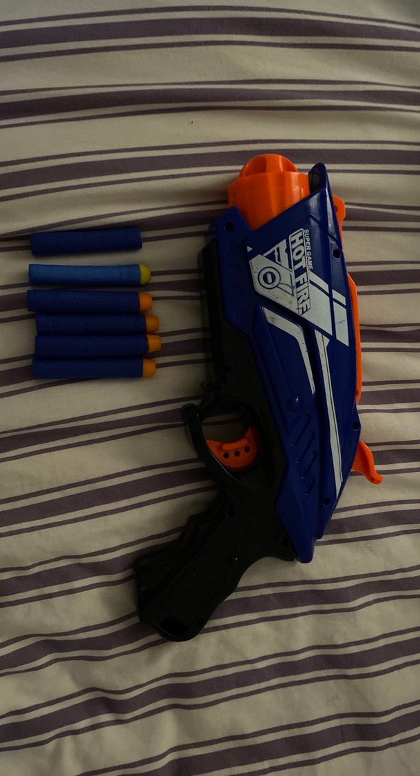 Koyu mavi ve turuncu detaylı Nerf oyuncak tabanca, yanında altı adet köpük mermi ile birlikte gelir. Rahat tutuşlu ve basit tasarımlıdır.