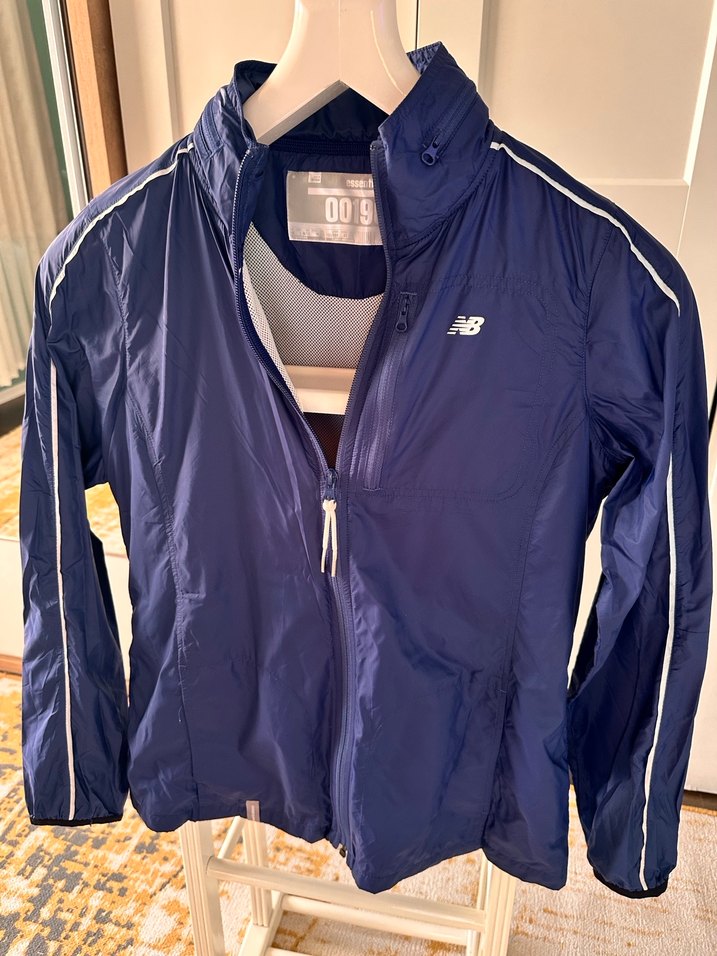 Parlak mavi New Balance spor ceket, dar kesim, yüksek yakalı ve fermuarlı. Uzun kollu, omuzlarda beyaz çizgilerle sportif tarz için uygundur. Medıum/ Large olarak gözüküyor. Amerikadan alınma orijinal ürün. ♀️