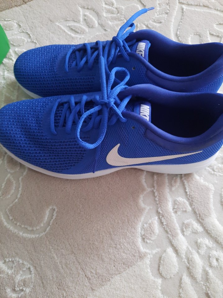 Mavi renkli Nike bağcıklı erkekspor sneaker, parlak yüzey ve kauçuk taban ile spor ve sokak stilini birleştirir. 46 numaradır
