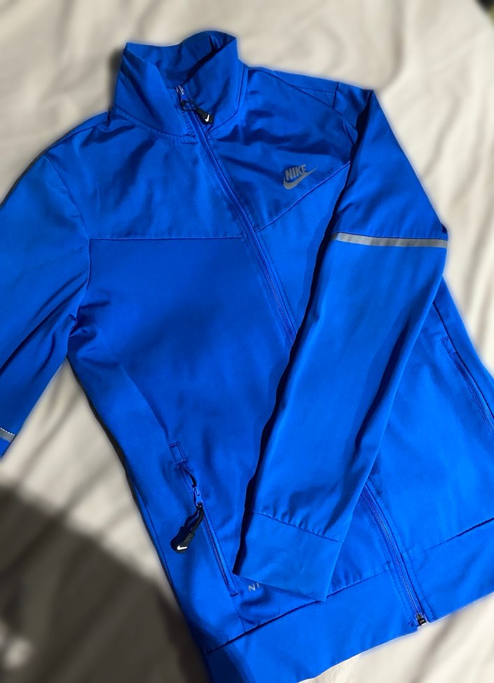 Fermuarlı ve yüksek yakalı bu mavi Nike erkek ceketi, uzun kollu ve parlak görünümlüdür. Yumuşak kumaştan üretilmiştir, spor ve sokak tarzı için uygundur. orjinal üründür. herhangi bir kusuru yoktur.