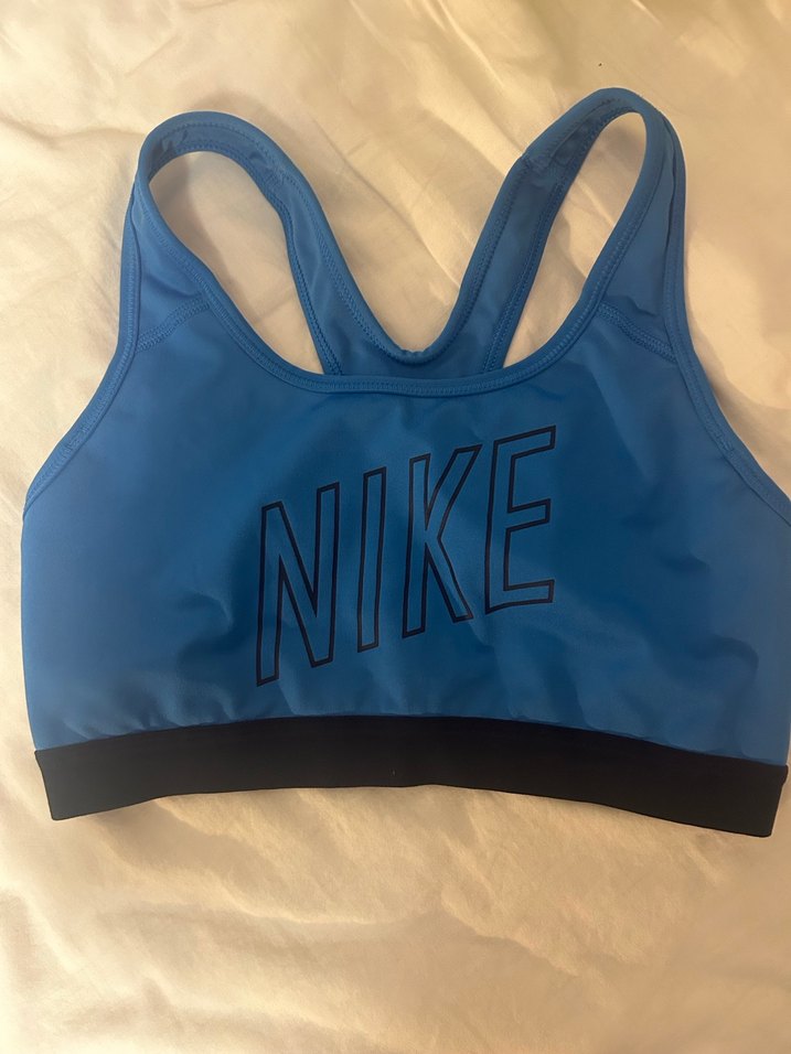 Mavi renkli Nike sporcu sütyeni, baskılı logo ve rahat midi uzunlukta, athleisure ve streetwear tarzlarına uygundur. ️
