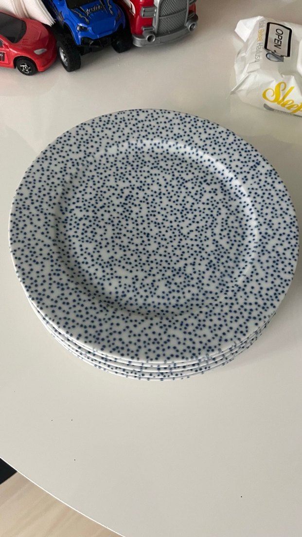 Gri zemin üzerine mavi nokta desenli, yiyecek servisine uygun tabak seti. ️