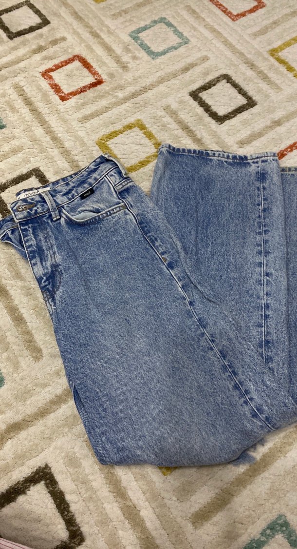 Normal boy, bol kesim, mavi denim kadın kot pantolon. Desensiz ve rahat, gündelik kullanıma uygun şık bir tarz sunar.