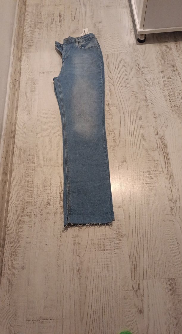 Mavi denim kumaştan, normal boyda ve regular fit kesime sahip kadın pantolon. Günlük kullanıma uygun, rahat ve sade bir görünüm sunar. Alt kısmı hafifçe yıpranmış detaylıdır.