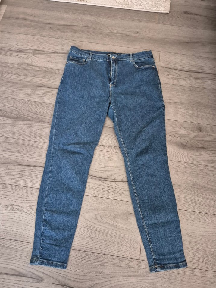 Mavi denim kumaştan, normal boy ve regular fit kesime sahip, günlük kullanıma uygun rahat bir kadın pantolonu.