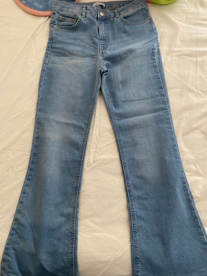 Pastel mavi tonlarda, normal boy, regular fit ispanyol /bol paça pantolon. Günlük kullanıma uygun, rahat ve şık bir normcore tarz sunar.