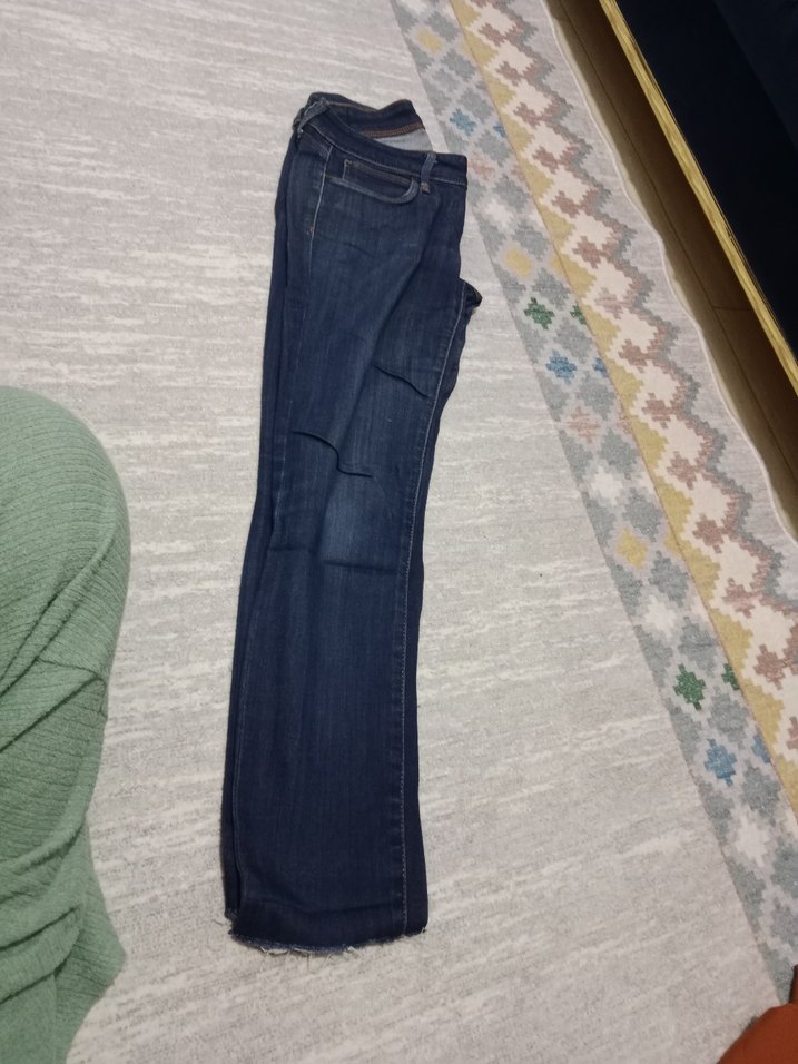 mavi renkte, normal boyda, bel kemerli ve sade desensiz kadın kot pantolonudur. Günlük kullanıma uygundur.