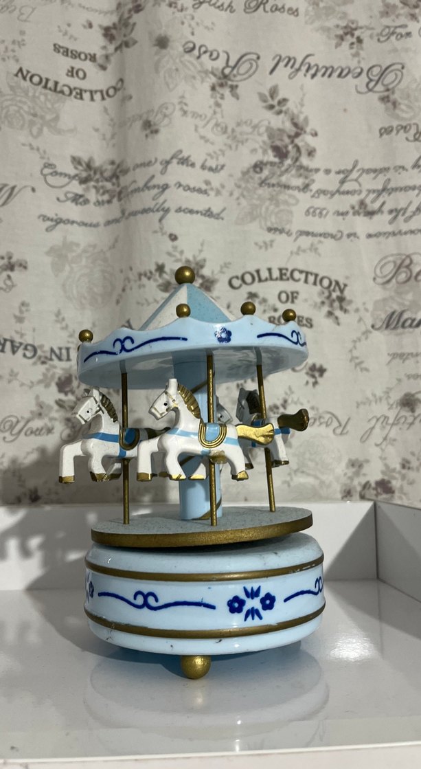 Pastel mavi renkte, beyaz atlı nostaljik dönen atlı karınca müzik kutusu. Altın detaylarla süslenmiş, kurmalı ve müzik çalar.