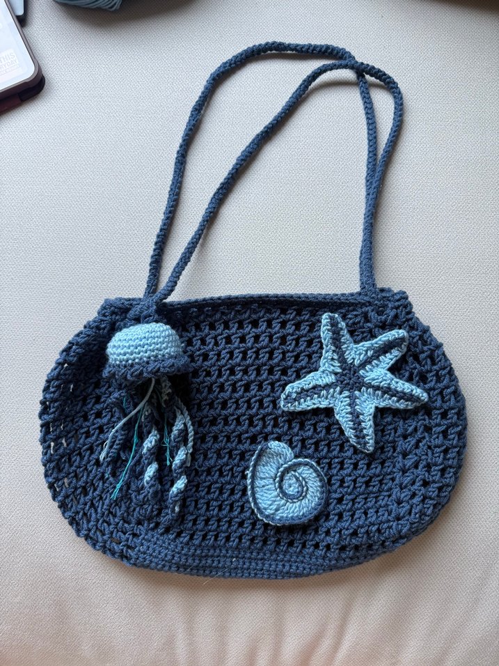 Mavi örgüden yapılmış, deniz temalı charm’lara sahip bohem tarzda kadın çantası. Akrilik yün ile örülmüştür, isteğinize göre makrome ile de örebilirim. Ürün astarlıdır ikinci görselde görebilirsiniz. Sipariş üzerine örüyorum ilanı satın almadan iletişime geçebilirseniz çok sevinirim.