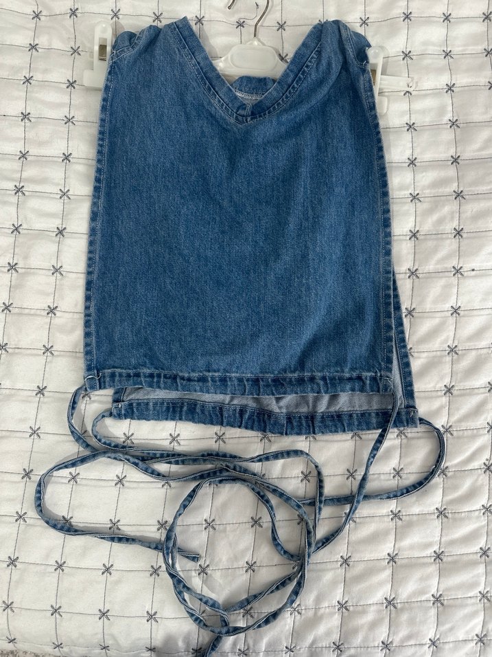 Yumuşak mavi kumaştan yapılmış, ayarlanabilir bağcıkları olan önlük .