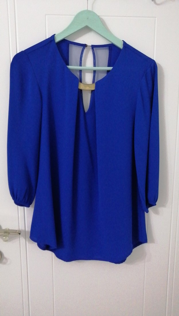 Mavi, V yakalı ve uzun kollu kadın bluz. Bol kesim yakasında metal detayı arka yakada tül detayı var.. Krep kumaşa sahip buluz fakir kol şık ve kullanışlı tasarıma sahip.